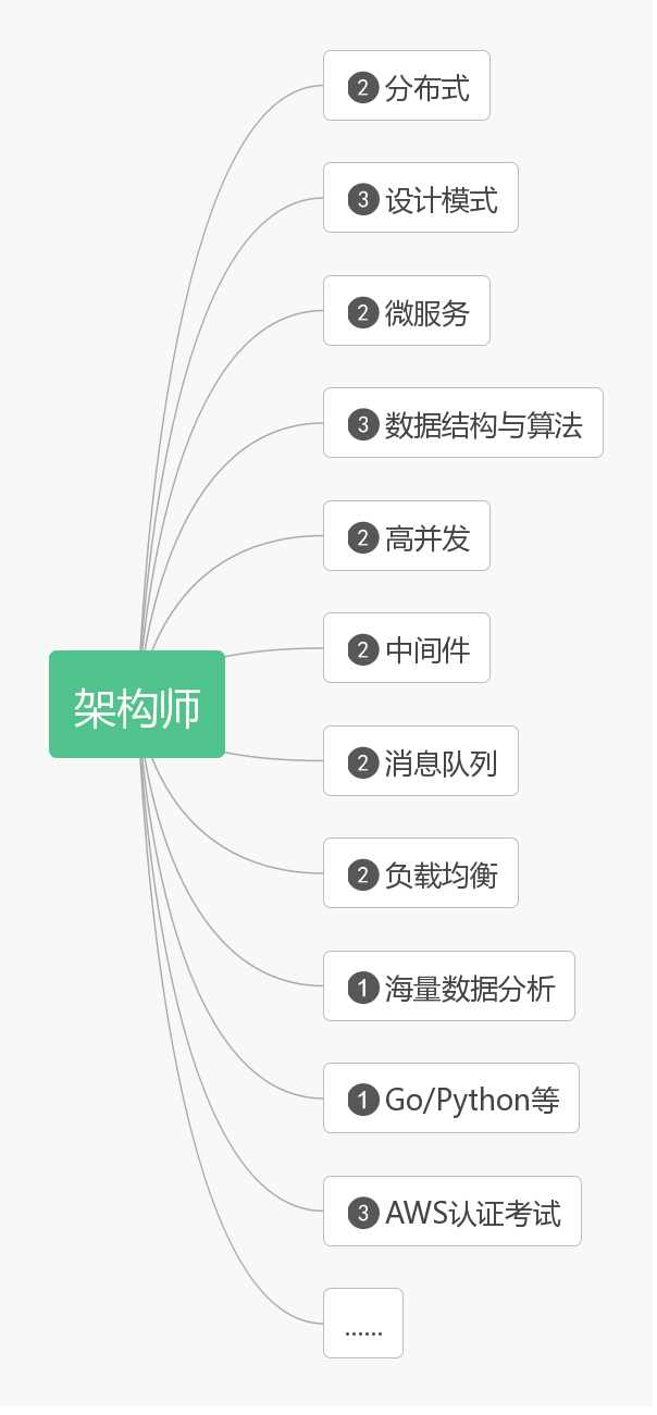 - 目标感:没有对自己的职业规划设置目标也很容易迷失自己,造成眉毛胡子一把抓的情况。排除这种困惑也很简单。如果你想成为一个web开发工程师,可以在本子上列出来需要具备的技能,然后分清重点主次,然后各个击破.比如可能web开发工程师可能基础的有ES6,Typescript,html5,css3等,熟练这些技能以后可以掌握一些前端框架,辟如angular、react.js、vue.js;如果你想成为一名后端架构师,可能要求掌握的很多,如下图:然后我们可以根据权重标识出当下首先要掌握的模块.这样可以有一个循序渐进的过程. 掌握的知识点就会更系统,更扎实.