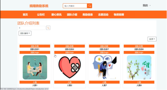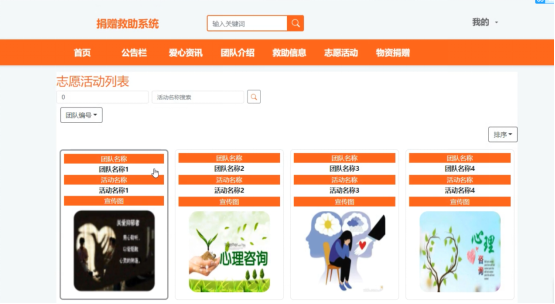 (2)模块管理功能需求:模块管理部分主要实现了团队介绍管理、加入团队管理、救助信息管理、爱心救助管理、志愿活动管理、活动报名管理,可以进行添加,编辑,删除和查询,同时可以对救助信息进行管理,进行救助,评论等操作。