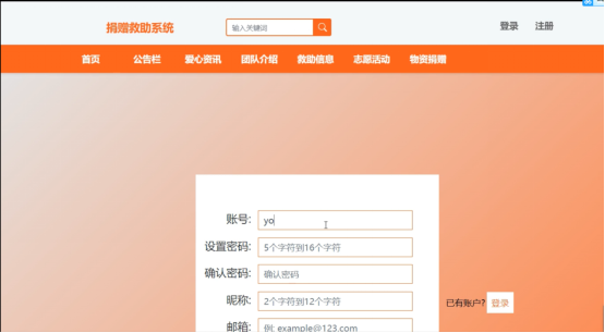 (1)注册登录功能需求:没有账号的志愿者,可以输入账号,密码,昵称,邮箱等信息进行注册操作,注册后可以输入账号和密码进行登录。
