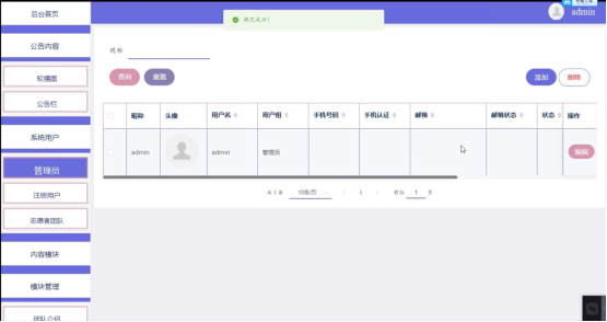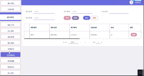 管理员在系统用户管理模块,可以对用户信息进行管理,用户管理模块由管理员,注册用户,志愿者团队三部分组成组成,这里以志愿者团队管理为例,具体的实现界面如下图:
