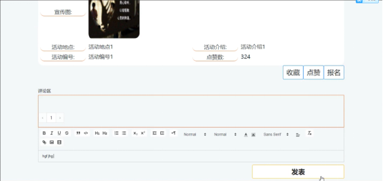 用户在志愿活动界面可以查看用户志愿活动信息,点击进入详细界面,可以评论,同时也可以发布内容,管理员可以管理用户发布的志愿活动信息,添加,编辑,删除,管理评论等,具体的实现界面如下图:
