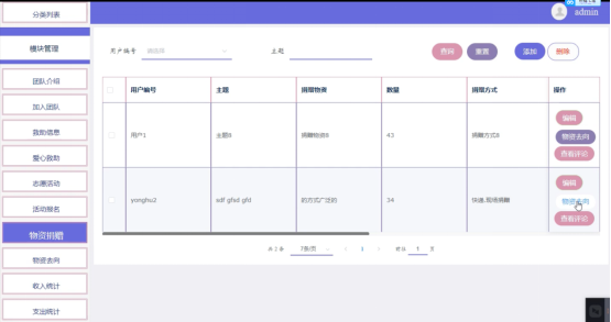 管理员在物资捐赠管理模块,可以对物资捐赠信息进行添加,修改,删除,管理评价,查询等,具体的实现界面如下图: