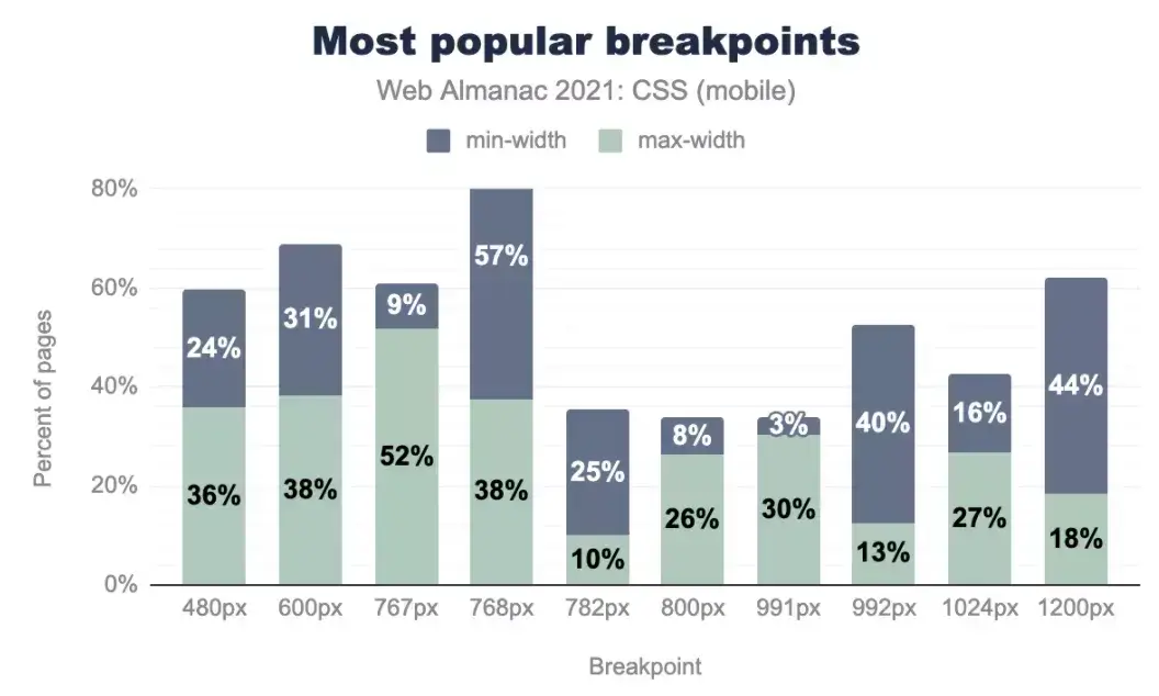 今为止最常见的断点是 767 和 768 px,这与 iPad 在纵向模式下的分辨率非常吻合。767px 被大量用作最大宽度断点,而很少用作最小宽度值。786px经常被用作最小和最大断点。 - 媒体查询属性