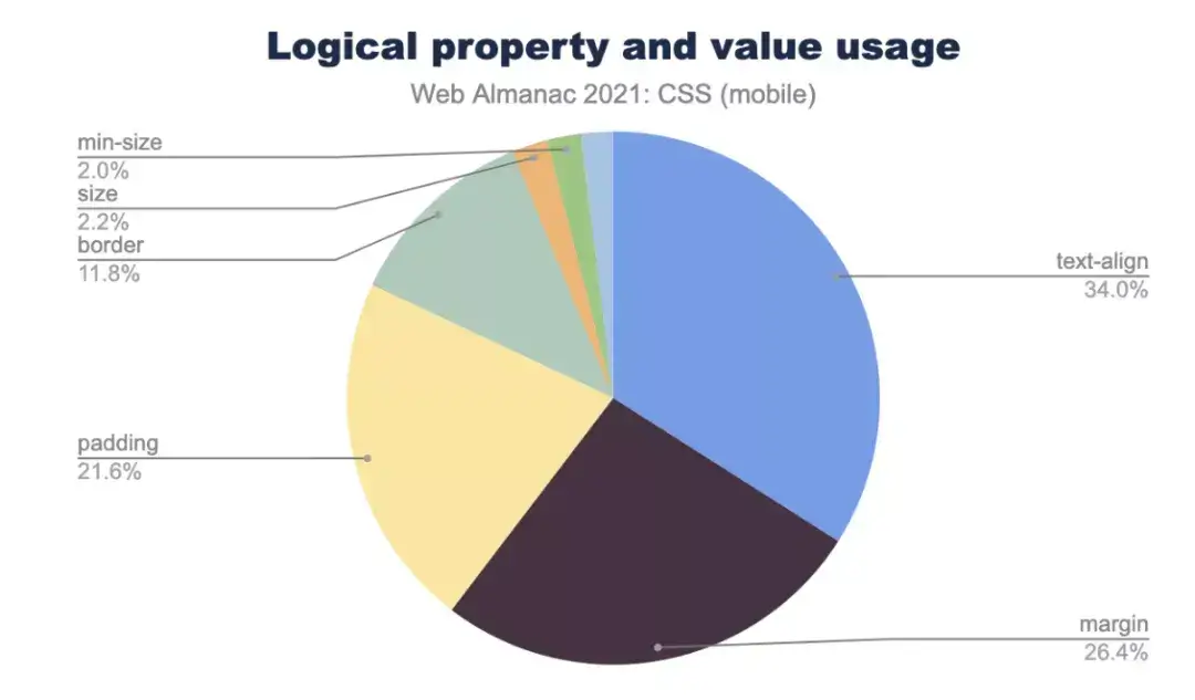 统计发现,只有 4% 的页面使用了逻辑属性。在这些页面中,大约 33% 的页面使用它来设置text-align为start或end。另外 46% 设置了逻辑边距和填充。