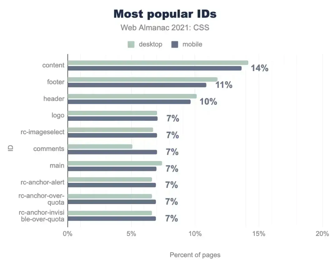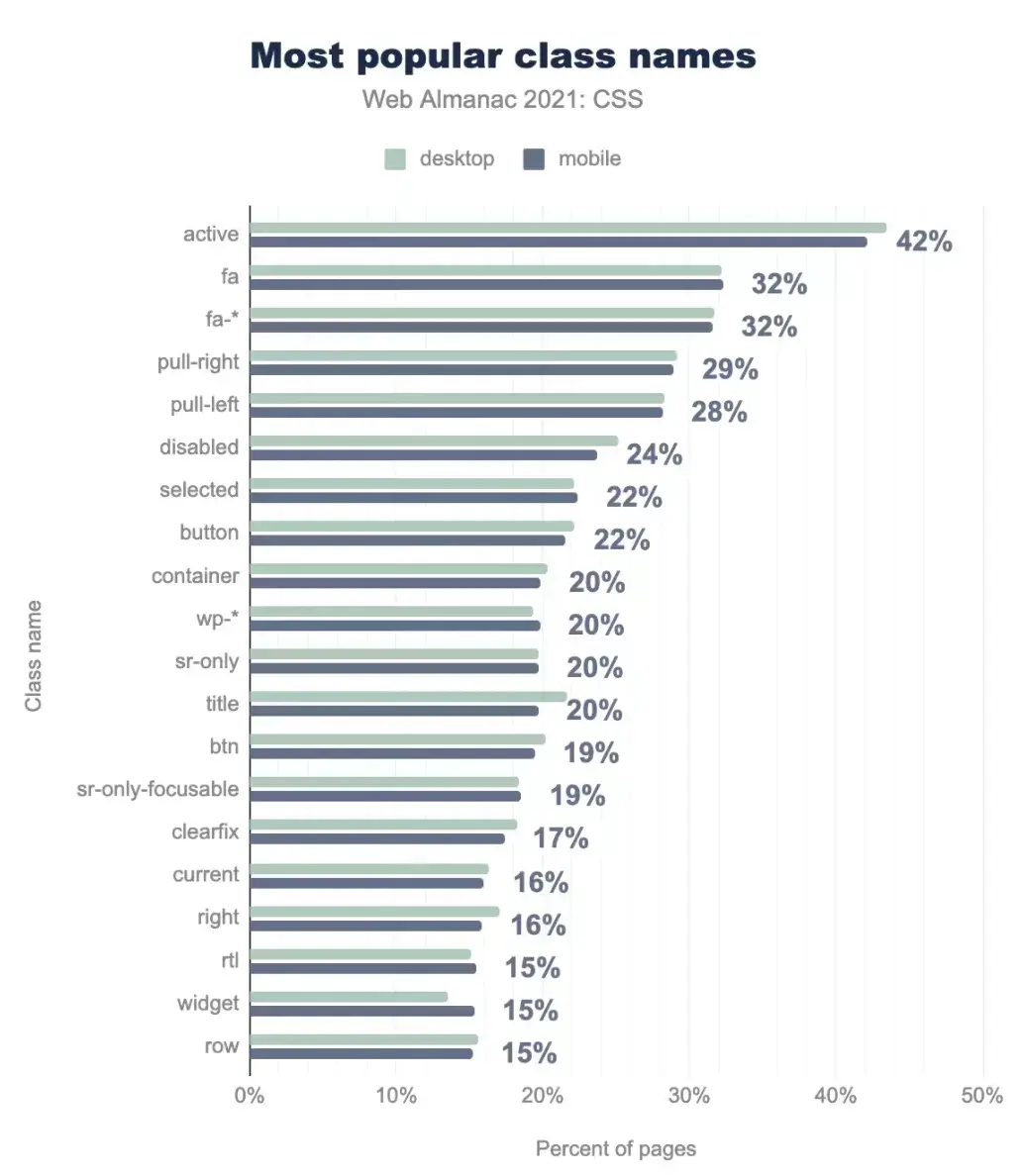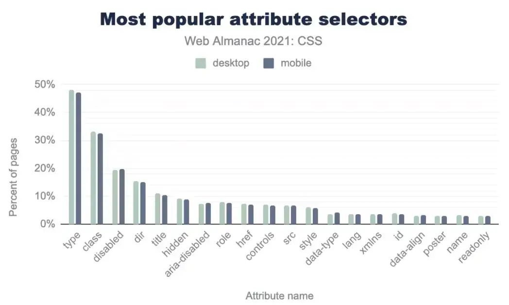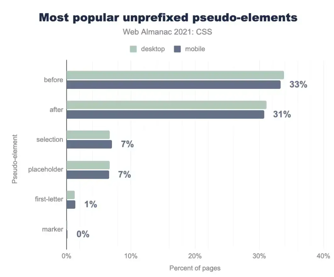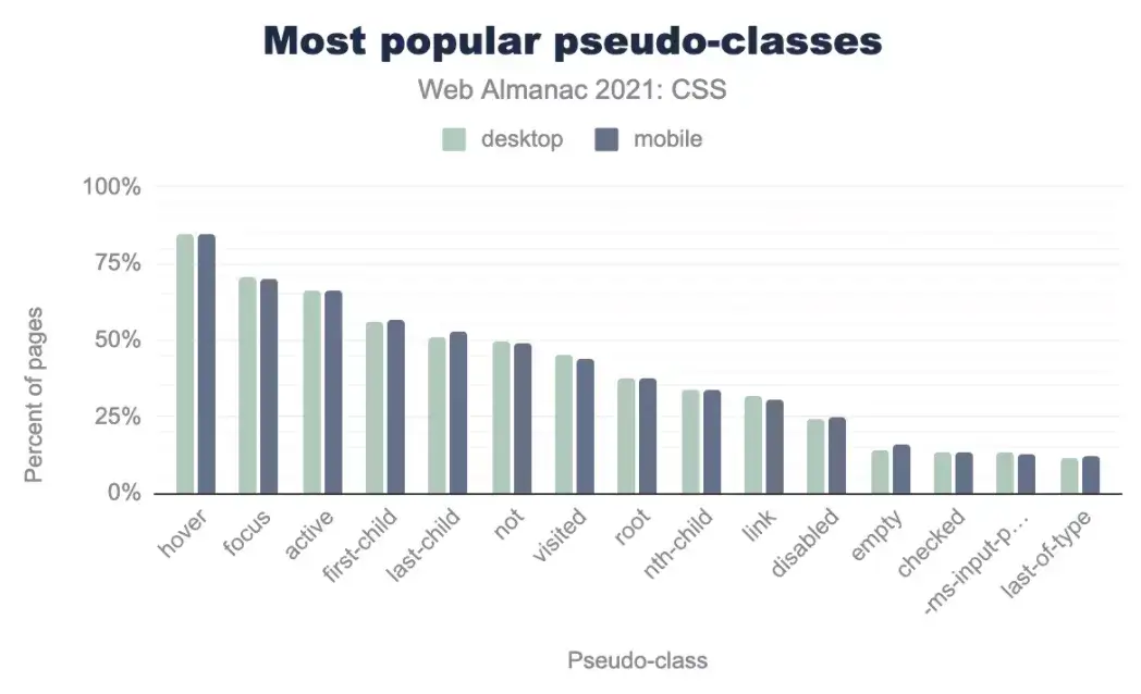 和 2020 年一样,用户操作伪类:hover、:focus和:active占据了前三名,它们都出现在至少三分之二的页面中。 - 伪元素