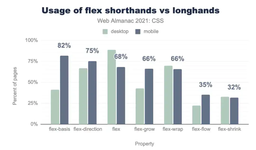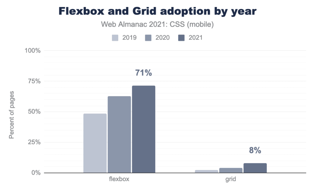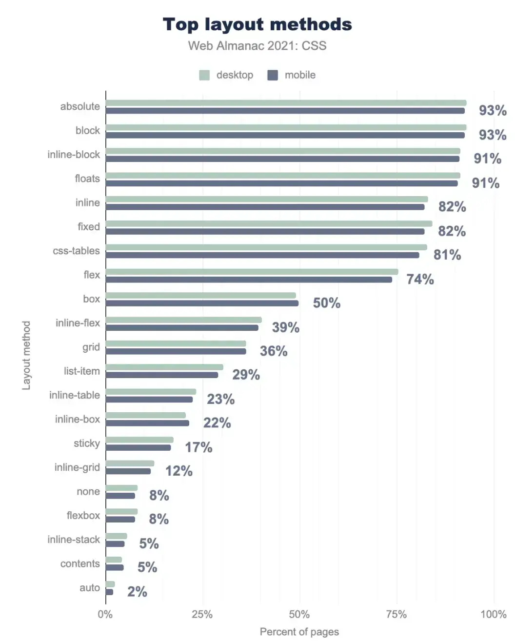 下面是在移动设备上采用Flexbox和Grid布局的比例分布: