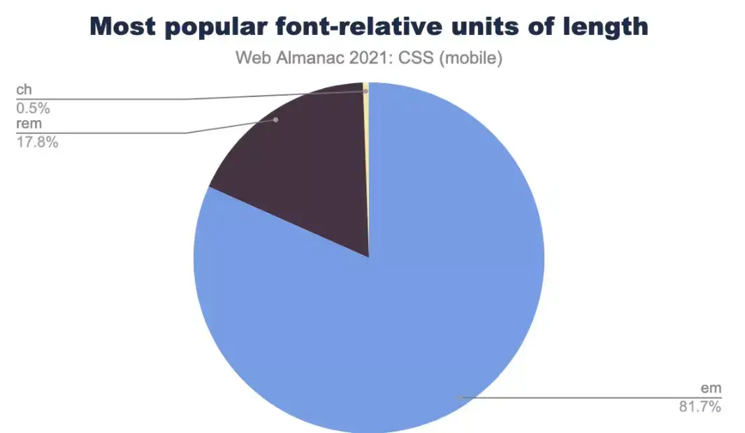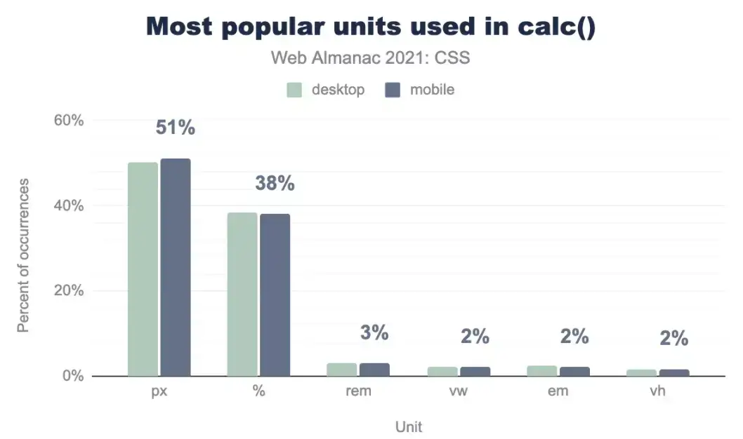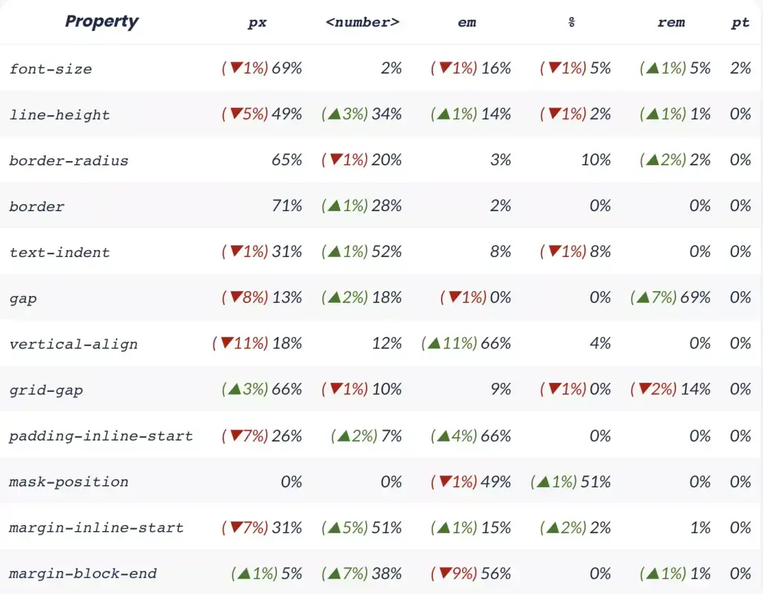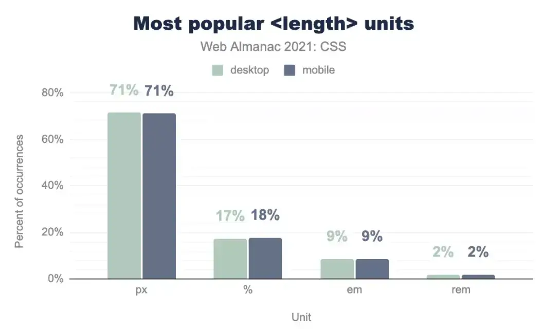 像素单位仍然是迄今为止最常用的长度单位,出现在了大约71%的页面中。