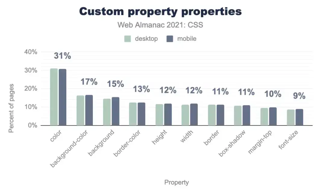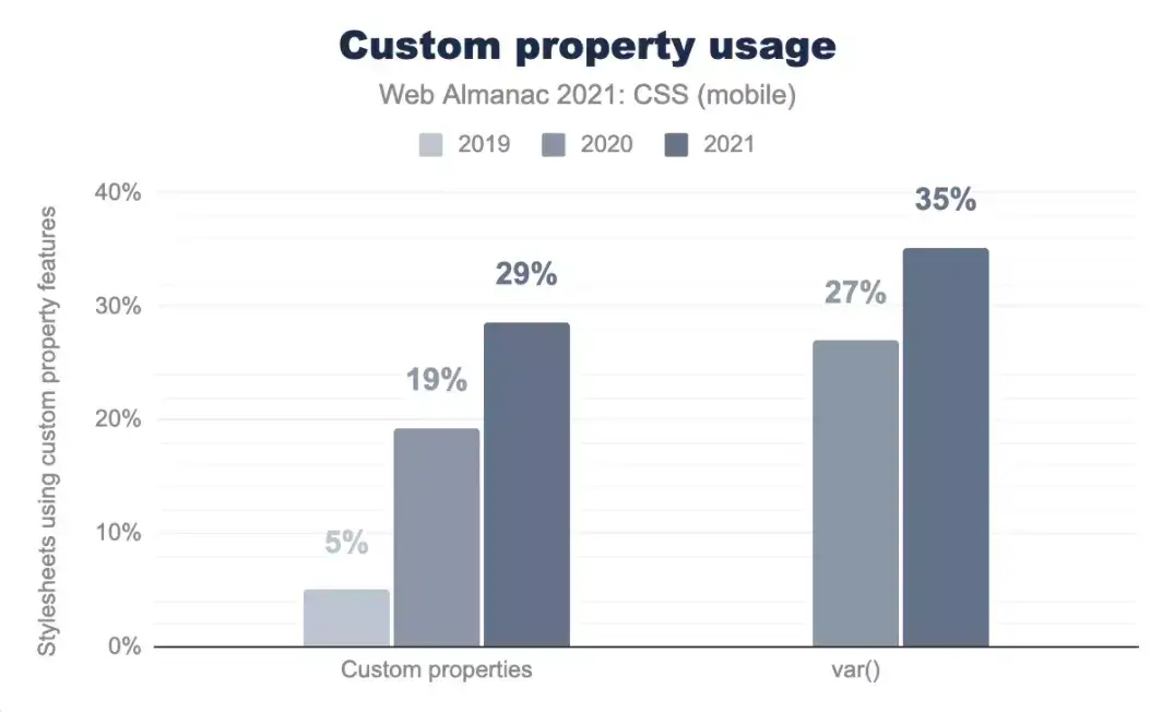 图片今年,28.6% 的移动页面和 28.3% 的桌面页面定义了自定义属性(也就是CSS变量)。并且,35.2% 的移动页面和 35.6% 的桌面页面包含至少一个var()值。