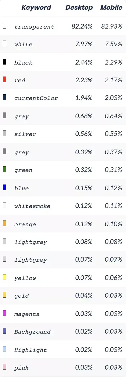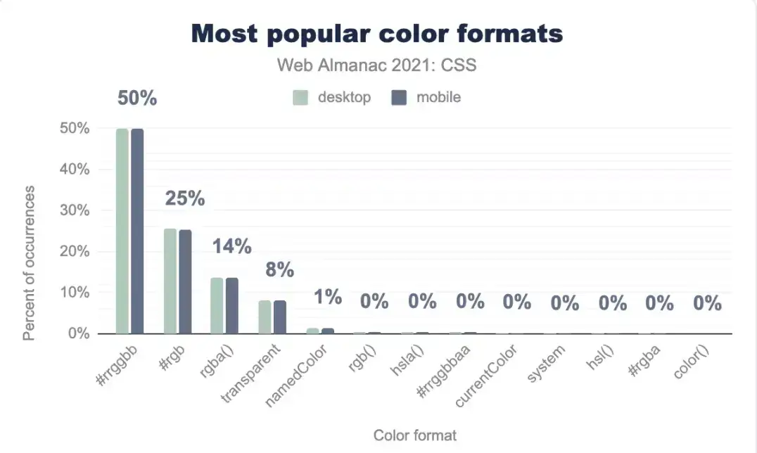 很长一段时间内,#RRGGBB格式一直是使用最多的颜色格式,超过了一半的颜色声明会使用这种格式。颜色值的 75% 都是使用十六进制和 RGB 语法表示的。