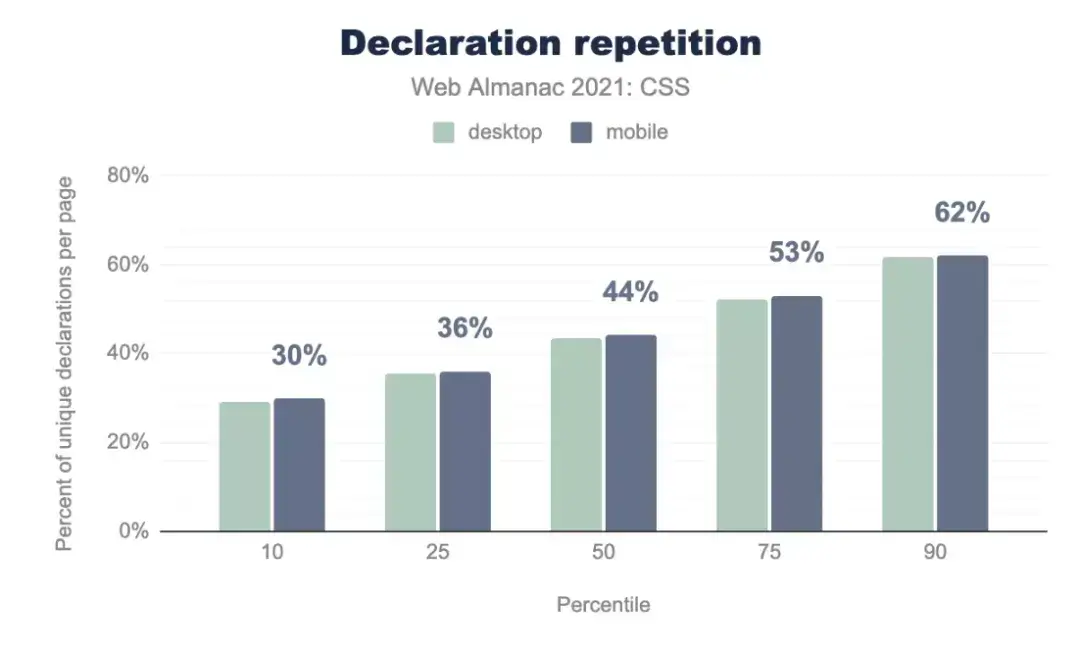 与去年相比,较高百分位的数量几乎没有变化,较低百分位的数量略有上升。在多数百分位的数量分布中,Web页面相对于移动页面的样式规则更多一点。