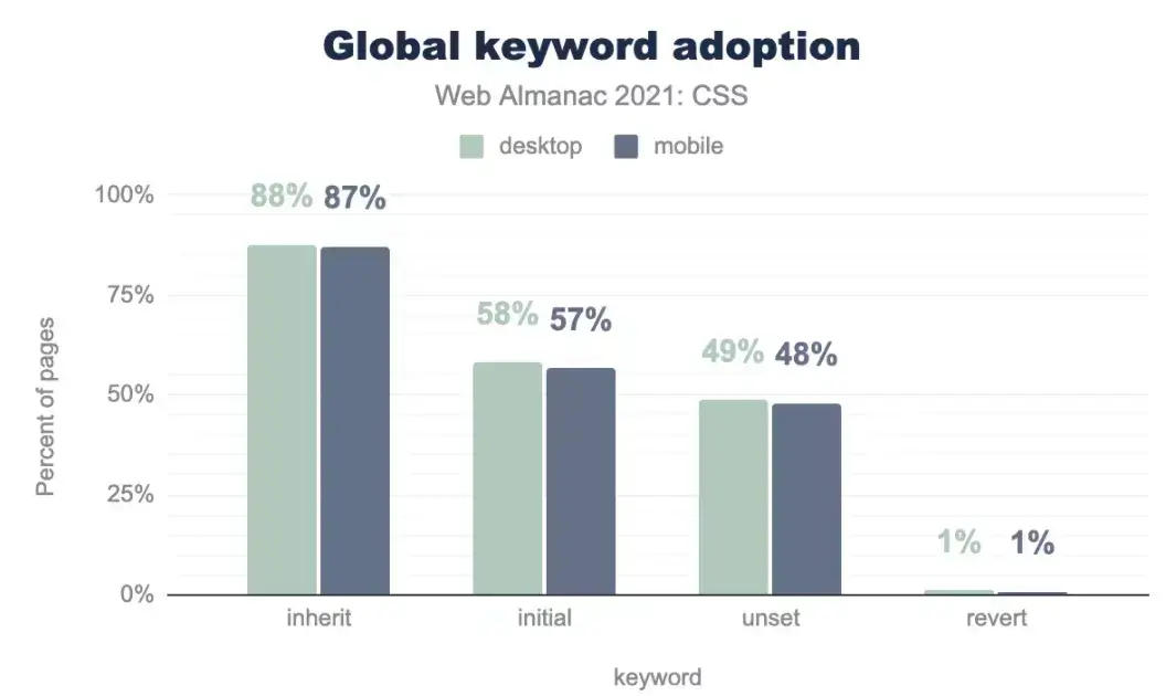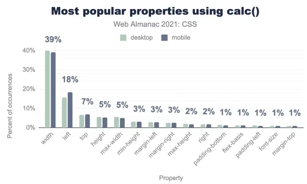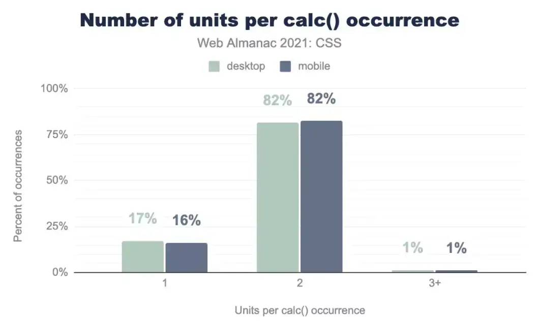 calc()值是相对简单的,绝大多数使用两种不同单位进行计算,例如从百分比值的计算结果中减去像素。总共 99% 的calc()表达式使用了一种或两种单位类型。 - 全局关键字