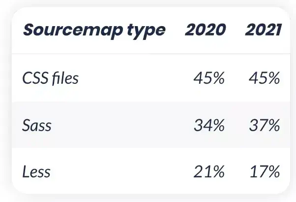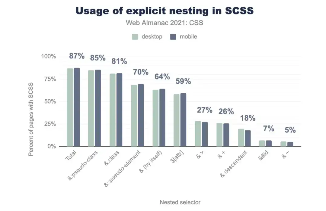 页面的CSS大小并未受到预处理器的显著影响。17%的Web页面 和 16.5%的移动页面 包含预处理器,略高于去年的 15%。具体使用的样式如下: