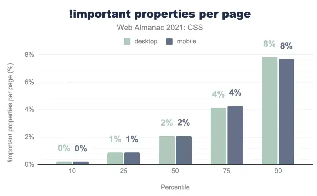调查发现,移动页面中最多有17,990 条!important规则,Web页面中最多有17,648 条!important规则。