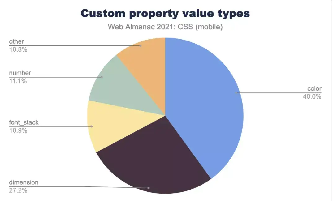 除此之外,使用自定义属性值的选择器, 60% 设置在根元素上(使用:root或html选择器),大约 5% 设置在元素上。其余的应用于根元素的某些后代而不是. 这意味着大约三分之二的自定义属性被用作实际上是全局常量。