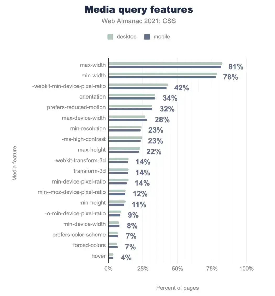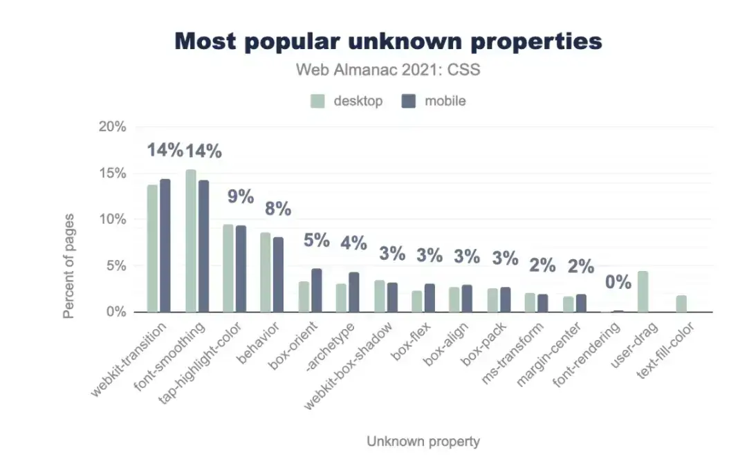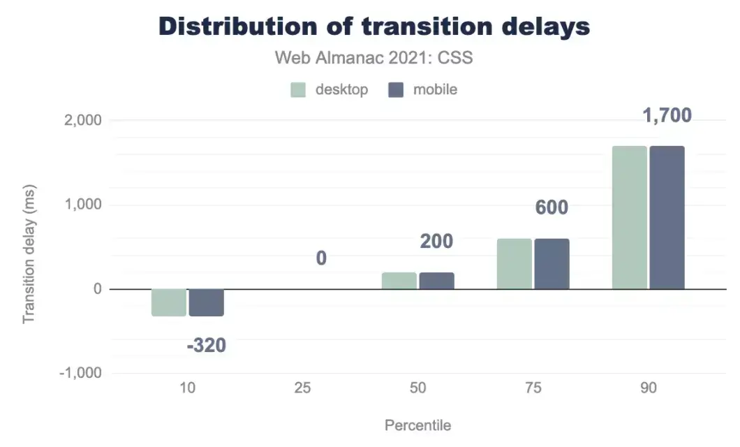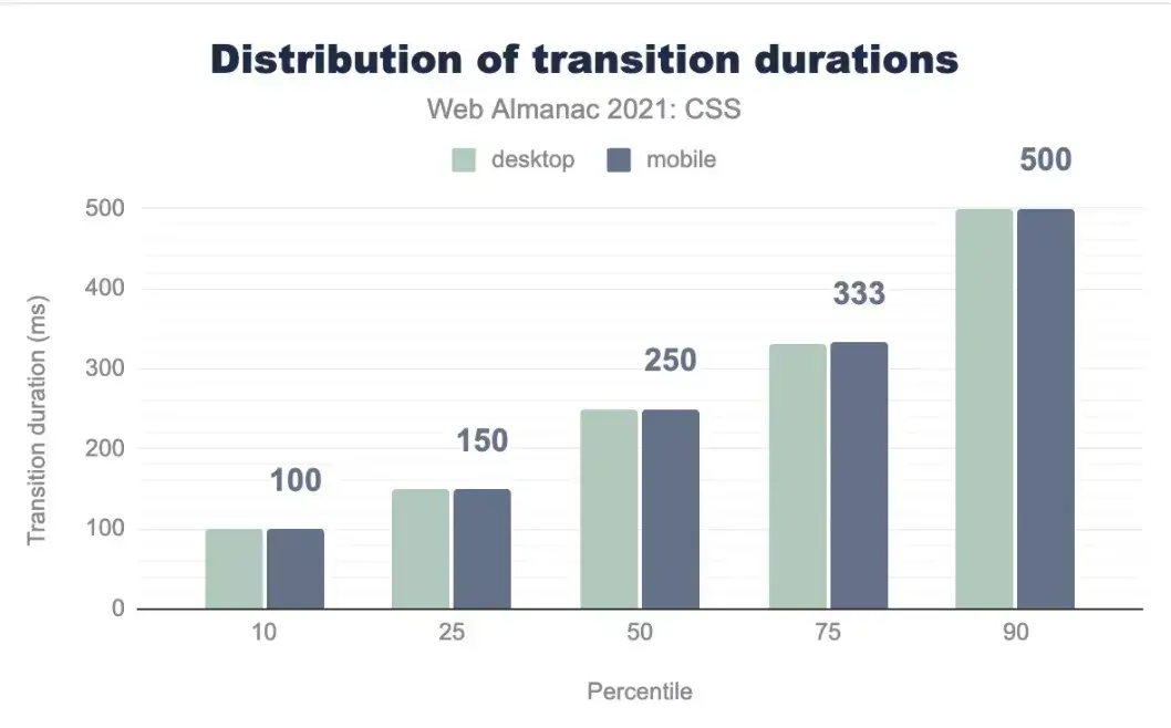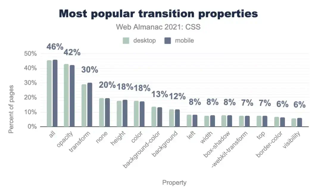 动画仍然是被广泛使用的,animation属性在 77% 的移动页面和 73% 的桌面页面上使用。transition属性在 85% 的移动页面和 90% 的桌面页面上使用。