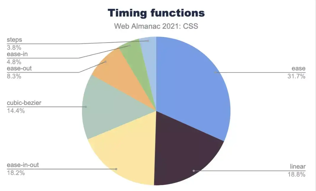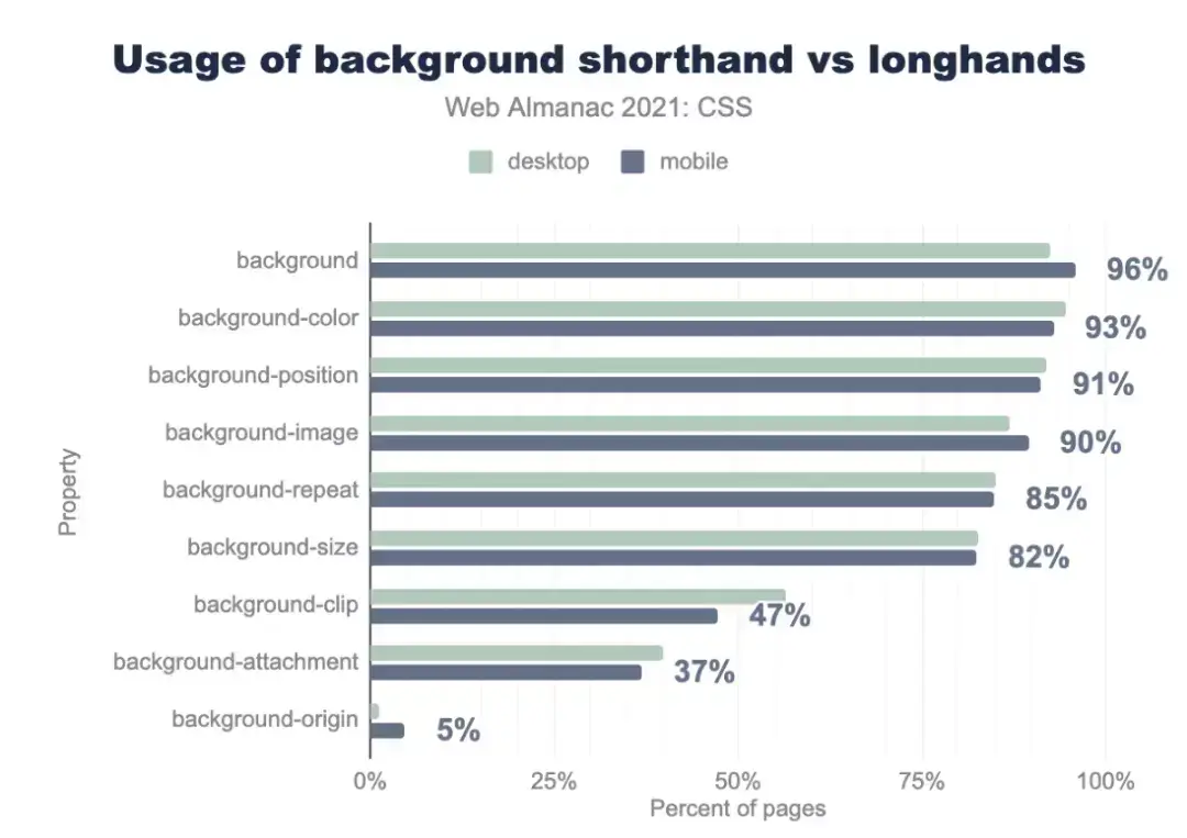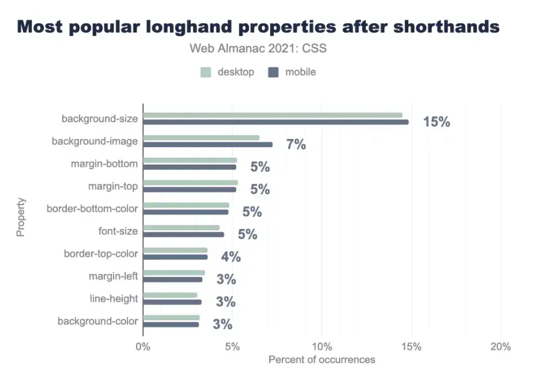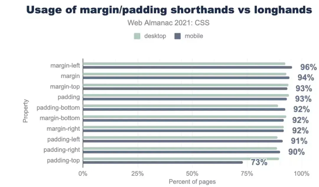 动画仍然是被广泛使用的,animation属性在 77% 的移动页面和 73% 的桌面页面上使用。transition属性在 85% 的移动页面和 90% 的桌面页面上使用。