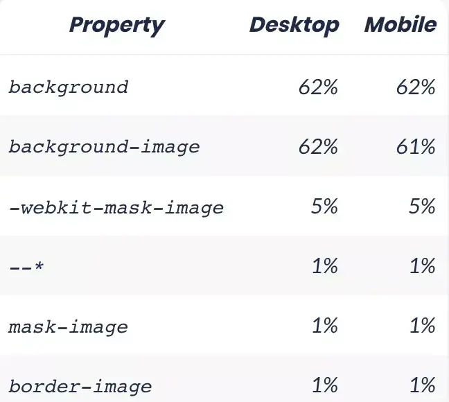 大多数的CSS不会加载大量的图片。在调查中,站点图片最多的CSS,其Web页面CSS中加载了6088张图片,移动页面CSS中加载了6089 张图片。 - CSS中图片大小