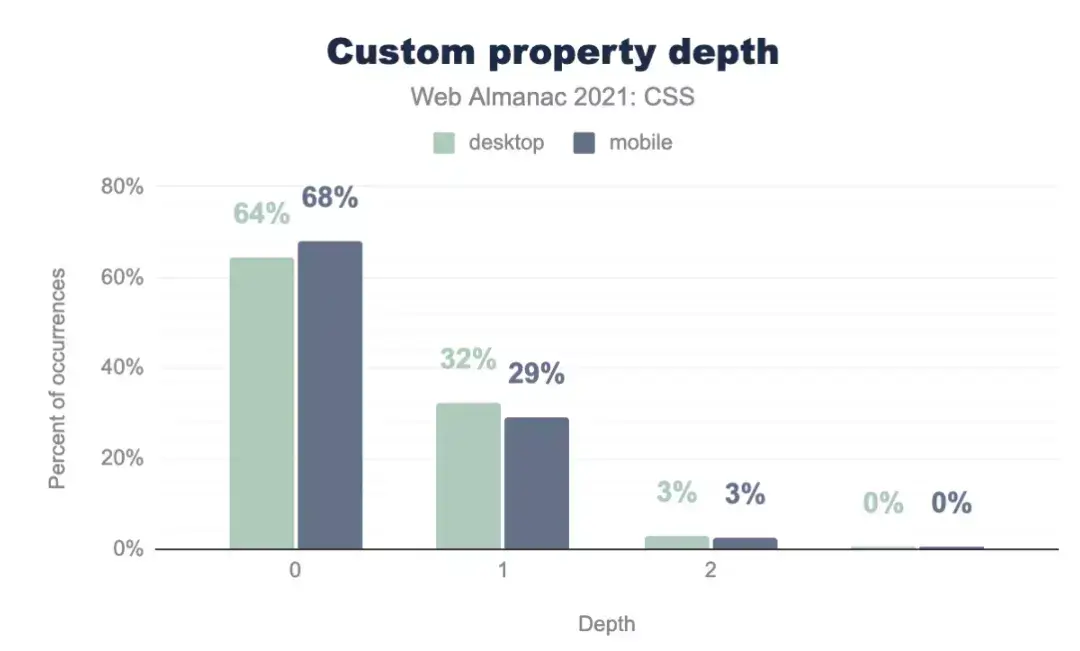 绝大多数自定义属性的值深度为零:它们没有在自己的值中包含其他自定义属性的值。近三分之一有一个深度级别,除此之外,几乎没有深度为两个或更多的自定义属性值。