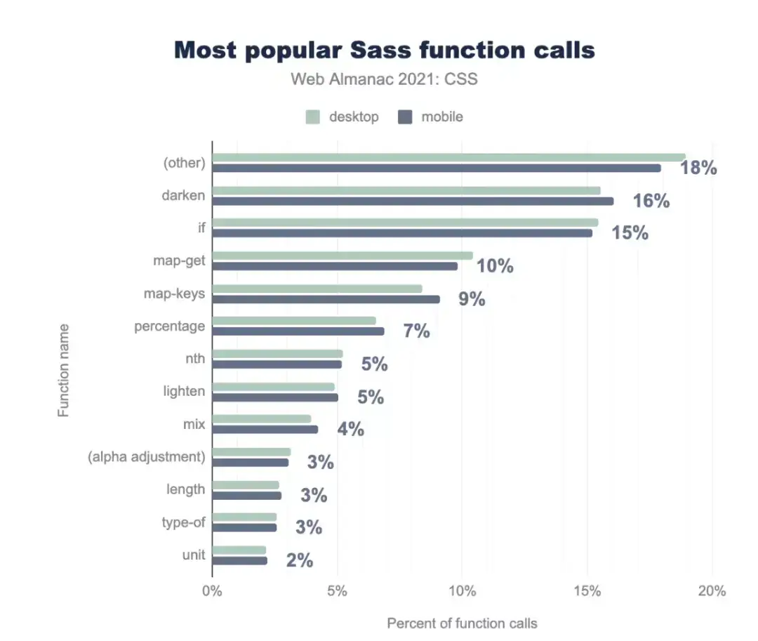 可以发现, Sass函数中有 28% 是修改颜色的函数(例如darken、mix),另外 6% 用于读取颜色(例如alpha、blue)。