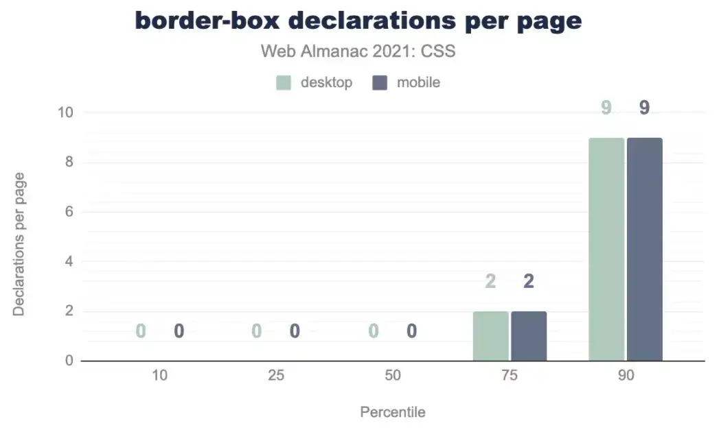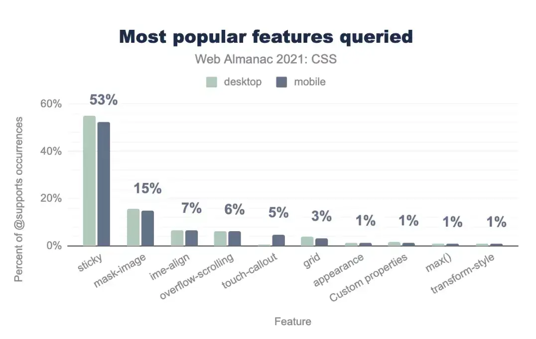 特征查询 ( @supports) 的使用继续保持增长。2019 年,有 30% 的页面在使用,2020年为 39% 。2021 年,将近 48% 的页面使用特征查询来决定在什么上下文中应用哪种 CSS。