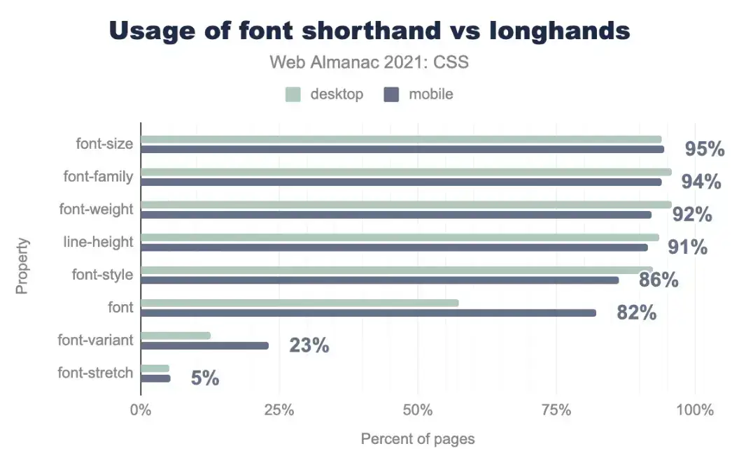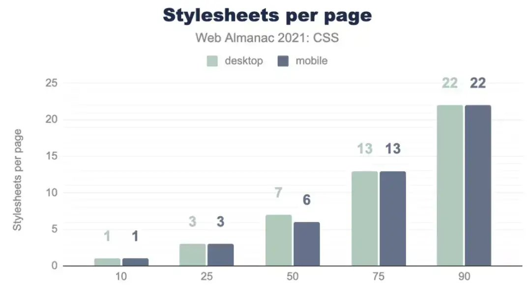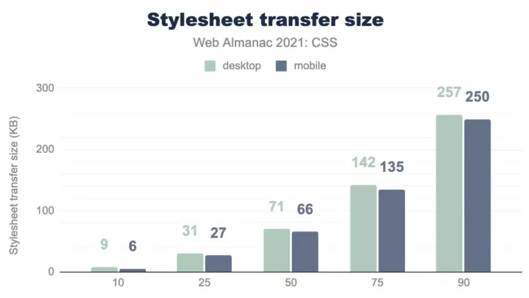 CSS文件每年的大小都在不断增长,中等页面的CSS文件大约 70KB,较大页面的CSS文件大约 250KB。与2020年相比,CSS文件大小的中位数增加了 7.9%,同时,移动端CSS所有的百分比都略低于Web端CSS。