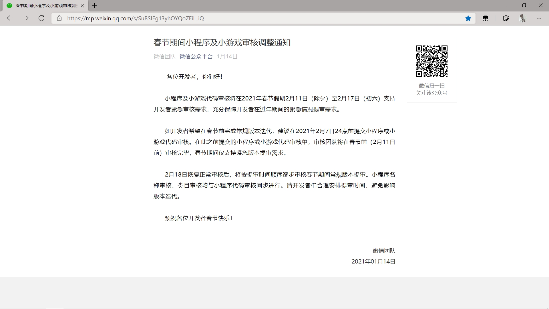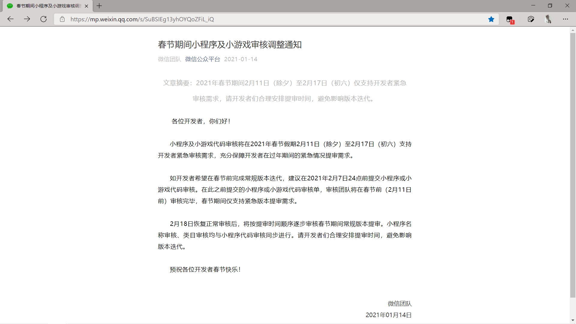 确保脚本在脚本管理器中处于启用状态,在浏览器中随意打开一篇推送,例:春节期间小程序及小游戏审核调整通知。注:文章链接须以mp.weixin.qq.com开头