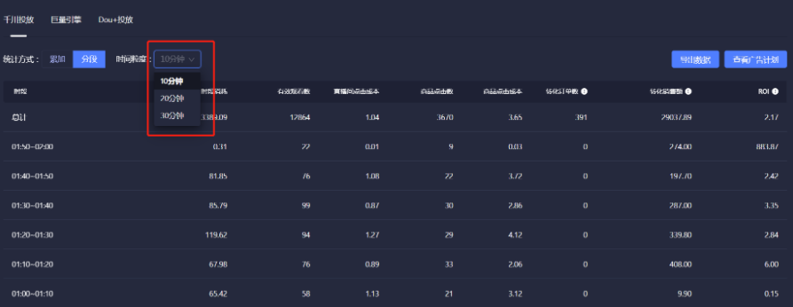【投放】页面对千川投放计划进行了适当的数据统计,还可以选择查看10分钟、20分钟、30分钟等不同的时间粒度内千川投放账户消耗金额及投放带来的转化数据,方便商家们实时监控和及时调整计划,以避免不必要的损失。