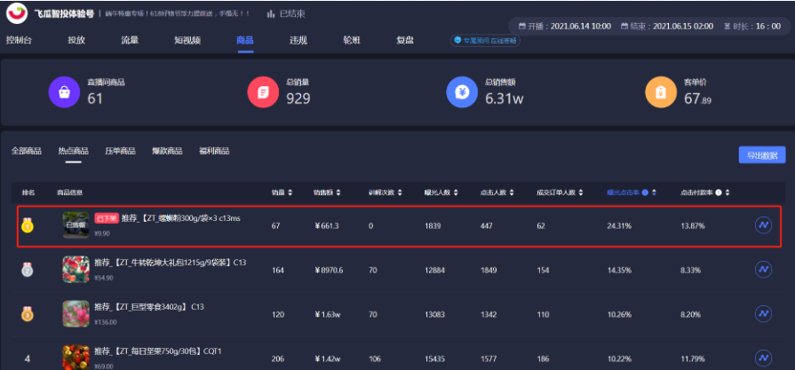 比如说下面这个直播间,我们可以看到螺狮粉的曝光量和点击率是最高的,综合单价和销售转化情况,我们可以将螺狮粉作为下次直播间的引流款和爆款,提高订单转化率。
