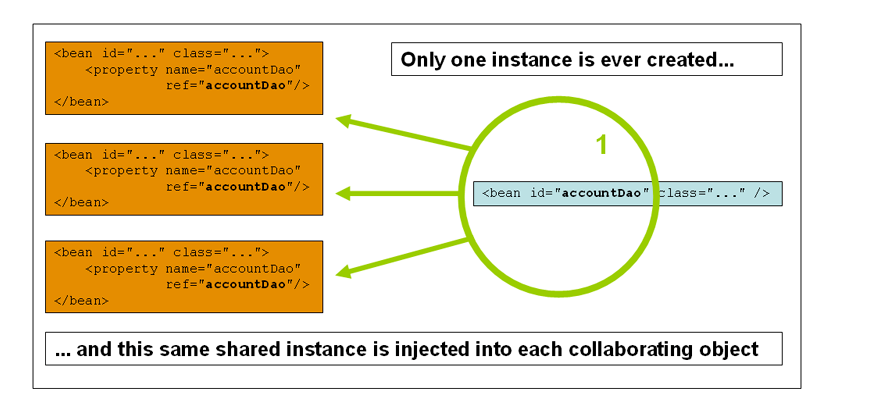 ①对象的实例个数。singleton类型的Bean定义,在一个容器中只存在一个共享的实例对象,所有对该Bean的依赖都引用这一单一实例对象。也就是说,IOC容器只生产一个该对象,并把该对象存入缓存当中。每次有谁请求该对象,就把这唯一的一个对象从缓存当中交给它,如果同时有多个对象依赖这个singleton对象实例,则大家依赖的都是同一个singleton实例对象,因为这个对象在IOC容器只存在一个嘛,大家当然就只能一起“共用”啦。