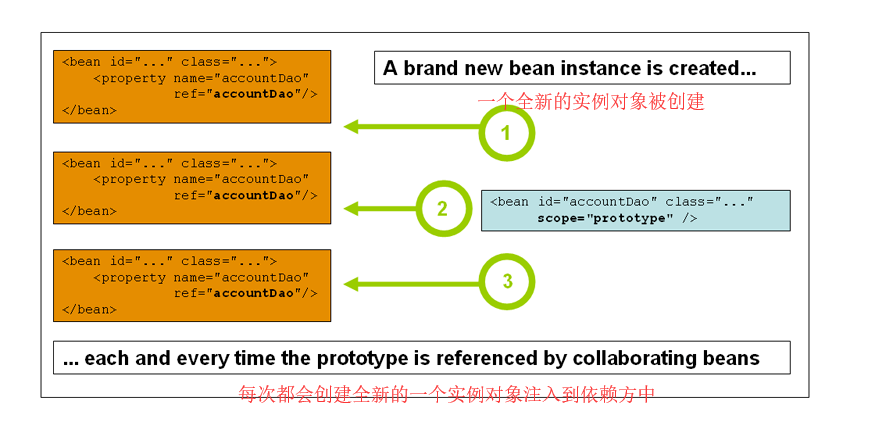 当然,对于DAO(Data Access Object)对象来说,通常并不会把它配置成为prototype类型的对象,因为通常DAO对象并不具备会话状态。所以我们通常都把DAO对象设置为singleton类型就好了。