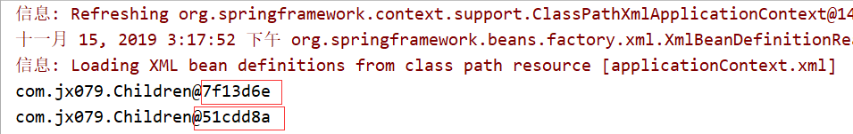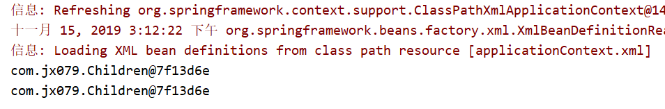 ApplicationContext ctx = new ClassPathXmlApplicationContext("applicationContext.xml");System.out.println(ctx.getBean("children"));System.out.println(ctx.getBean("children"));