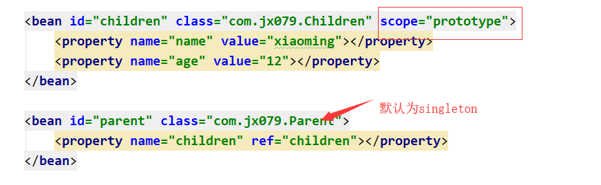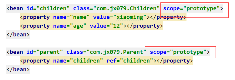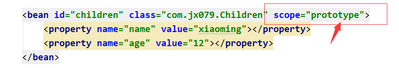 同样是以Children做例子,我们在ApplicationContext中配置该Bean的scope为“prototype”,如下: