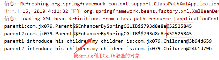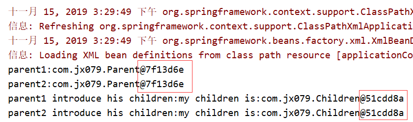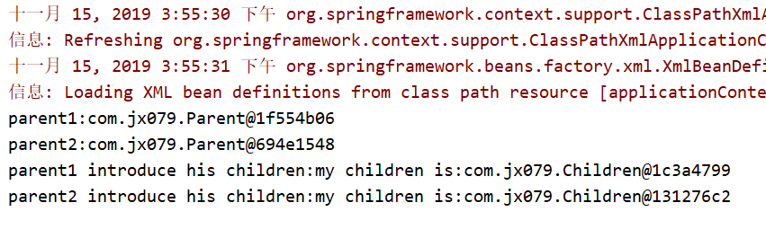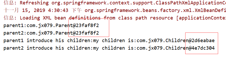 ApplicationContext ctx = new ClassPathXmlApplicationContext("applicationContext.xml");Parent parent1 = (Parent) ctx.getBean("parent");Parent parent2 = (Parent) ctx.getBean("parent");System.out.println("parent1:"+parent1);System.out.println("parent2:"+parent2);System.out.println("parent1 introduce his children:"+ parent1.sayHello());System.out.println("parent2 introduce his children:"+ parent2.sayHello());