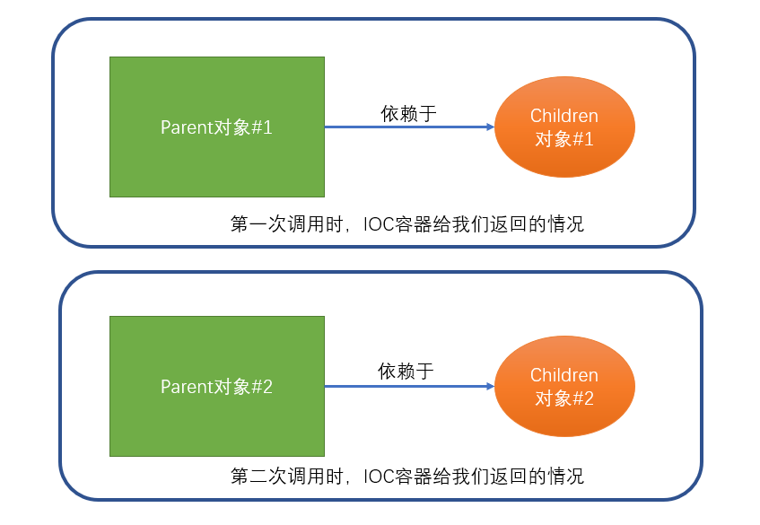 此时,每次向IOC容器获取的parent都是新的了,相应的children也是新的。But...,我们似乎还是没有实现最初的要求,假设我们现在就要求每次获取Parent对象都是同一个,但是它依赖的Children对象却不一样,那该怎么实现呢?