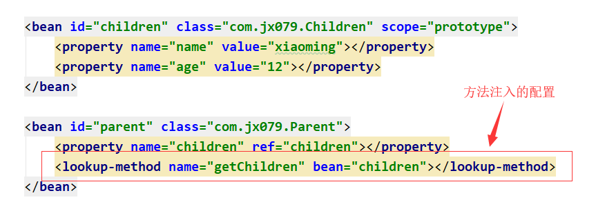 Spring容器提供了一种叫做方法注入的方式,可以帮助我们解决上述问题。我们需要做的很简单,只要让getChildren()方法声明符合规定的格式,并在配置文件中通知容器,当该方法被调用时,每次返回指定类型的对象即可。