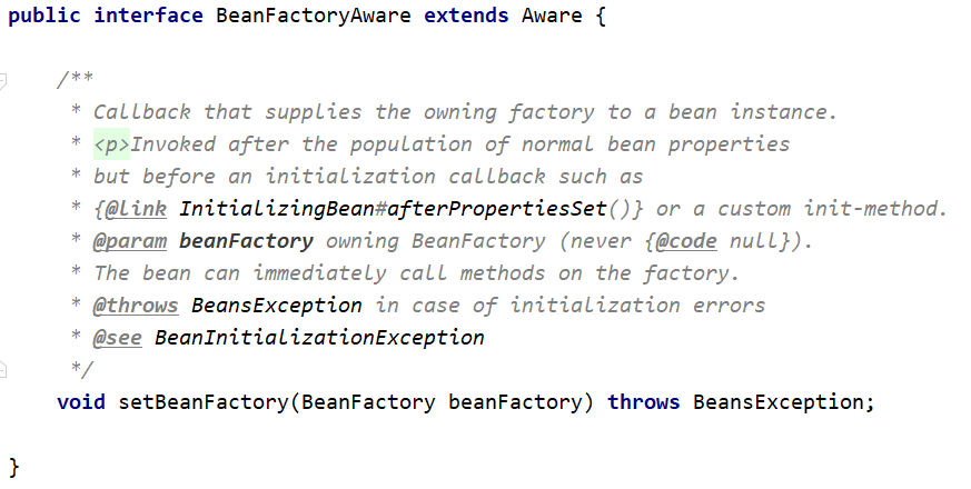 Spring框架提供了一个BeanFactoryAware接口,容器在实例化实现了该接口的bean定义的过程中,会自动将容器本身注入该Bean。这样,该Bean就持有了它所处的BeanFactory的引用。