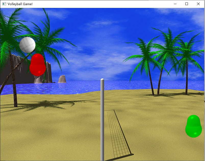 {RenderWindow window(VideoMode(800, 600), "Volleyball Game!");window.setFramerateLimit(60);Texture t1;Texture t2;Texture t3;t1.loadFromFile("./Resources/images/background.PNG");t2.loadFromFile("./Resources/images/ball.png");t3.loadFromFile("./Resources/images/blobby.png");t1.setSmooth(true);t2.setSmooth(true);t3.setSmooth(true);Sprite sBackground(t1);Sprite sBall(t2);Sprite sPlayer(t3);sPlayer.setOrigin(75 / 2, 90 / 2);sBall.setOrigin(32, 32);//box2dsetWall(400, 520, 2000, 10);setWall(400, 450, 10, 170);setWall(0, 0, 10, 2000);setWall(800, 0, 10, 2000);b2PolygonShape shape;shape.SetAsBox(30 / SCALE, 30 / SCALE);b2BodyDef bdef;bdef.type = b2_dynamicBody;//playersb2Body *pBody[2];for (int i = 0; i < 2; i++) {bdef.position.Set(20 * i, 2);b2CircleShape circle;circle.m_radius = 32 / SCALE;circle.m_p.Set(0, 13 / SCALE);pBody[i] = World.CreateBody(&bdef);pBody[i]->CreateFixture(&circle, 5);circle.m_radius = 25 / SCALE;circle.m_p.Set(0, -20 / SCALE);pBody[i]->CreateFixture(&circle, 5);pBody[i]->SetFixedRotation(true);}pBody[0]->SetUserData("player1");pBody[1]->SetUserData("player2");//ballbdef.position.Set(5, 1);b2CircleShape circle;circle.m_radius = 32 / SCALE;b2Body *b = World.CreateBody(&bdef);b2FixtureDef fdef;fdef.shape = &circle;fdef.restitution = 0.95;fdef.density = 0.2;b->CreateFixture(&fdef);b->SetUserData("ball");bool onGround = 0;while (window.isOpen()){Event e;while (window.pollEvent(e)){if (e.type == Event::Closed){window.close();}}for (int n = 0; n < 2; n++){World.Step(1 / 60.f, 8, 3);}//player1 b2Vec2 pos = pBody[0]->GetPosition();b2Vec2 vel = pBody[0]->GetLinearVelocity();if (Keyboard::isKeyPressed(Keyboard::Right)){vel.x = 5;}if (Keyboard::isKeyPressed(Keyboard::Left)){vel.x = -5;}if (Keyboard::isKeyPressed(Keyboard::Up)){if (pos.y*SCALE >= 463){vel.y = -13;}}if (!Keyboard::isKeyPressed(Keyboard::Right)){if (!Keyboard::isKeyPressed(Keyboard::Left)){vel.x = 0;}}pBody[0]->SetLinearVelocity(vel);//player2 pos = pBody[1]->GetPosition();vel = pBody[1]->GetLinearVelocity();if (Keyboard::isKeyPressed(Keyboard::D)){vel.x = 5;}if (Keyboard::isKeyPressed(Keyboard::A)){vel.x = -5;}if (Keyboard::isKeyPressed(Keyboard::W)){if (pos.y*SCALE >= 463){vel.y = -13;}}if (!Keyboard::isKeyPressed(Keyboard::D)){if (!Keyboard::isKeyPressed(Keyboard::A)){vel.x = 0;}}pBody[1]->SetLinearVelocity(vel);//ball max speedvel = b->GetLinearVelocity();if (vel.Length() > 15){b->SetLinearVelocity(15 / vel.Length() * vel);}//Drawwindow.draw(sBackground);for (b2Body* it = World.GetBodyList(); it != 0; it = it->GetNext()){b2Vec2 pos = it->GetPosition();float angle = it->GetAngle();if(it->GetUserData() == "player1"){sPlayer.setPosition(pos.x*SCALE, pos.y*SCALE);sPlayer.setRotation(angle*DEG);sPlayer.setColor(Color::Red);window.draw(sPlayer);}if (it->GetUserData() == "player2"){sPlayer.setPosition(pos.x*SCALE, pos.y*SCALE);sPlayer.setRotation(angle*DEG);sPlayer.setColor(Color::Green);window.draw(sPlayer);}if (it->GetUserData() == "ball"){sBall.setPosition(pos.x*SCALE, pos.y*SCALE);sBall.setRotation(angle*DEG);window.draw(sBall);}}window.display();}return 0;