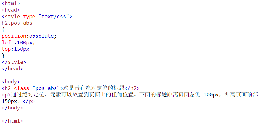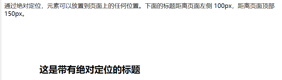 元素框从文档流完全删除,并相对于其包含块定位。包含块可能是文档中的另一个元素或者是初始包含块。元素原先在正常文档流中所占的空间会关闭,就好像元素原来不存在一样。元素定位后生成一个块级框,而不论原来它在正常流中生成何种类型的框。所以给一个绝对定位的框添加边距时是相对其包含框的,但是如果没调整边距,默认情况是和上一个元素对齐。例如下面这段代码: