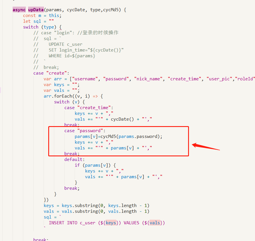 case "password":params[v]=cycMd5(params.password);keys += v + ","vals += "'" + params[v] + "',"