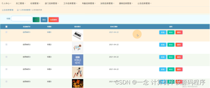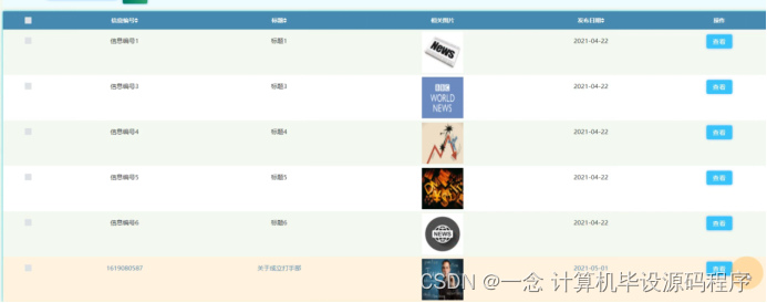 公告信息管理,在公告信息管理页面可以查看信息编号、标题、相关图片、发布日期等信息,并可根据需要进行查看等操作,如图5-15所示。