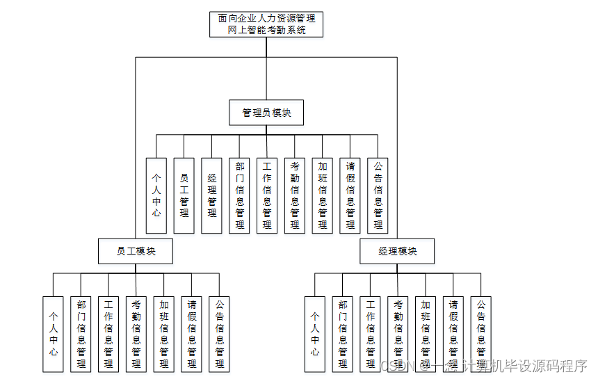 系统架构图属于系统设计阶段,系统架构图只是这个阶段一个产物,系统的总体架构决定了整个系统的模式,是系统的基础。面向企业人力资源管理网上智能考勤系统的整体结构设计如图4-2所示。