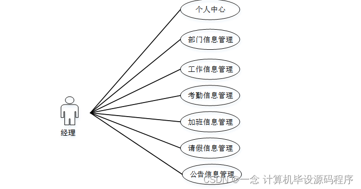 经理进入系统可以进个人中心、部门信息管理、工作信息管理、考勤信息管理、加班信息管理、请假信息管理、公告信息管理等。经理用例如图3-9所示。