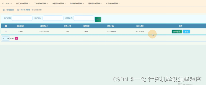 部门信息管理,在部门信息管理页面可以查看部门名称、部门地址、经理工号、经理姓名、联系手机、发布日期等信息,并可根据需要进行安排工作、查看等操作,如图5-10所示。