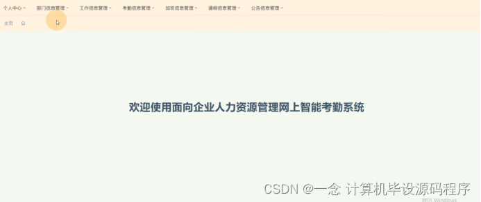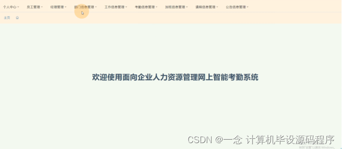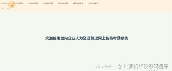 员工登录进入面向企业人力资源管理网上智能考勤系统可以查看个人中心、部门信息管理、工作信息管理、考勤信息管理、加班信息管理、请假信息管理、公告信息管理等内容进行详细操作,如图5-16所示。