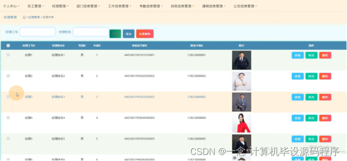 经理管理,在经理管理页面可以查看经理工号、经理姓名、性别、年龄、身份证号码、联系手机、相片等信息,并可根据需要进行查看,修改或删除等操作,如图5-4所示。