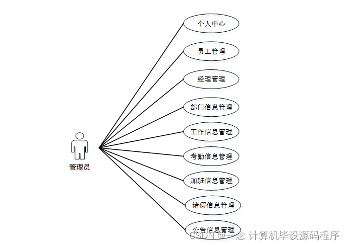 系统中的核心用户是系统管理员,管理员登录后,通过管理员菜单来管理后台系统。主要功能有:个人中心、员工管理、经理管理、部门信息管理、工作信息管理、考勤信息管理、加班信息管理、请假信息管理、公告信息管理等功能。管理员用例如图3-7所示。