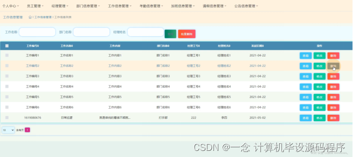 工作信息管理,在工作信息管理页面可以查看工作编号、工作名称、工作内容、部门名称、经理工号、经理姓名、发起日期等信息,并可根据需要进行查看,修改或删除等操作,如图5-11所示。