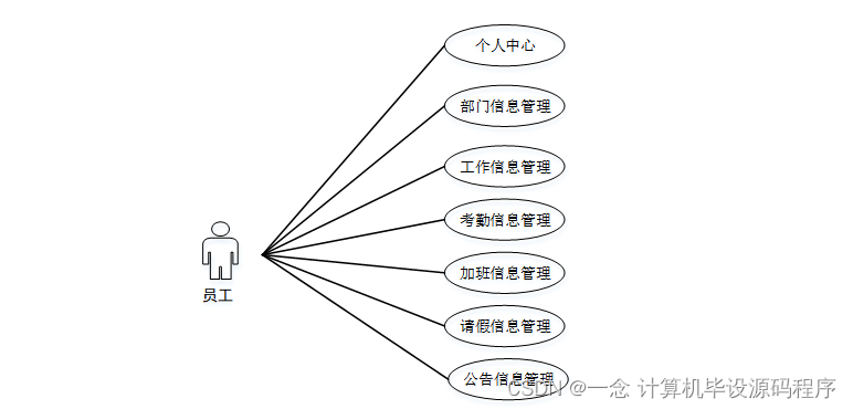员工进入系统可以进个人中心、部门信息管理、工作信息管理、考勤信息管理、加班信息管理、请假信息管理、公告信息管理等。员工用例如图3-8所示。