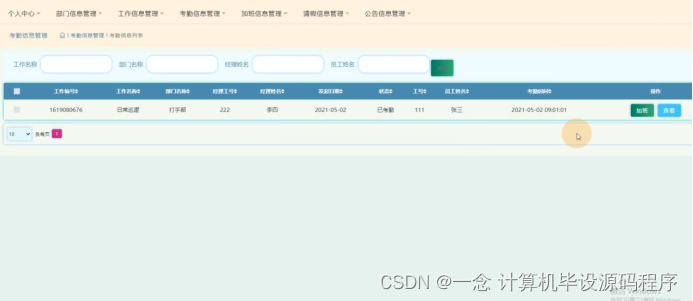 考勤信息管理,在考勤信息管理页面可以查看工作编号、工作名称、部门名称、经理工号、经理姓名、发起日期、状态、工号、员工姓名、考勤时间等信息,并可根据需要进行加班、查看等操作,如图5-12所示。