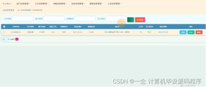 加班信息管理,在加班信息管理页面可以查看工作编号、工作名称、部门名称、经理工号、经理姓名、发起日期、加班时长、备注、工号、员工姓名、登记日期等信息,并可根据需要进行查看等操作,如图5-19所示。
